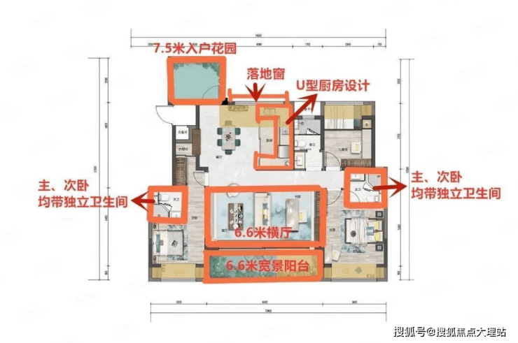 总体而言,7.5米入户花园,6.6米大横厅,主、次卧带独立卫浴空间,16㎡的餐、厨大空间,这样的产品在世面上还是很吃香的。