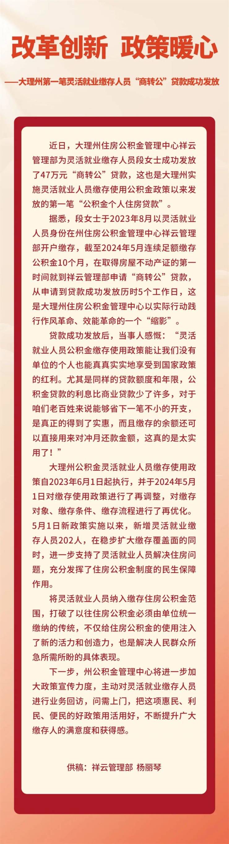 近日,大理州住房公积金管理中心祥云管理部为灵活就业缴存人员段女士成功发放了47万元“商转公”贷款...