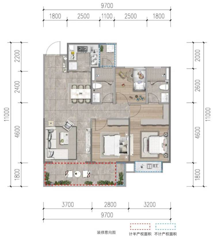 建面约105㎡,三房两厅两卫设计,南北通透,同样动静分区双阳台。