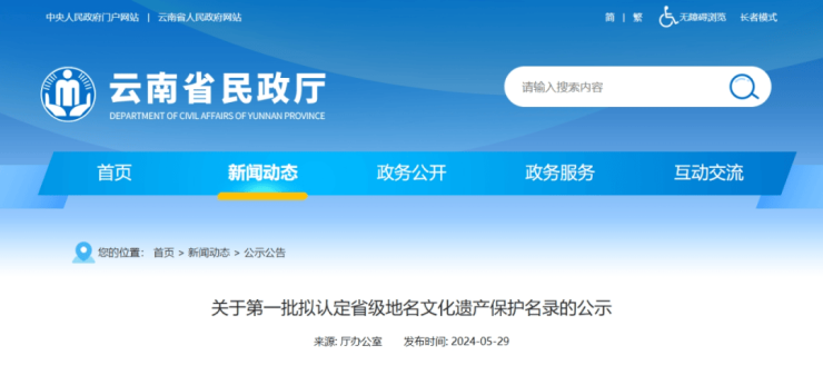 为深入贯彻落实《地名管理条例》及其实施办法,进一步挖掘保护和弘扬传承全省优秀地名文化,充分展现云南七彩地名背后的历史底蕴和文化内涵,助力和推动“有一种叫云南的生活”,根据《云南省省级地名文化遗产认定规范》《云南省民政厅办公室关于开展第一批省级地名文化遗产认定工作的通知》有关要求,在各地自愿申报基础上,经征求省级有关部门意见、组织专家评审,拟将下列16个地名(名单附后)列入第一批省级地名文化遗产保护名录,现予以公示,公示期为2024年5月29日—6月4日,共7天。公示期间,如对名录有异议,请以书面形式向云南省民政厅区划地名处反映。
