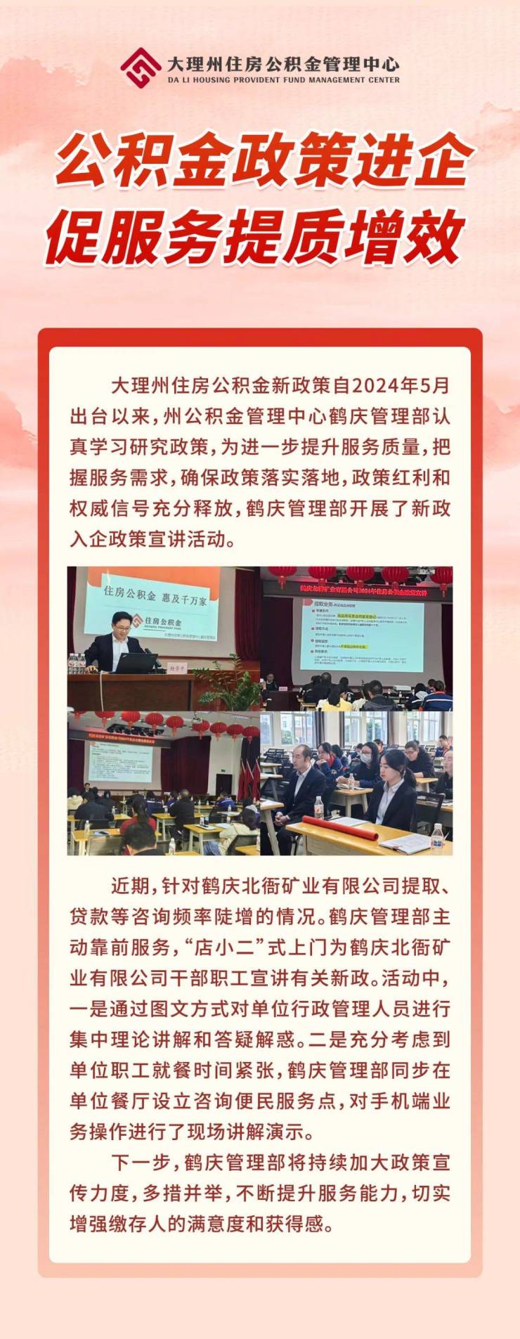 大理州住房公积金新政策自2024年5月出台以来,州公积金管理中心鹤庆管理部认真学习研究政策,为进一步提升服务质量...