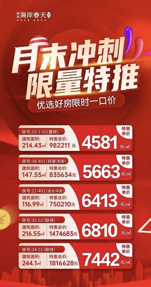 纳思·海岸春天,建面约116-249㎡实景现房,即买即办证,优选好房限时一口价!关注纳思·海岸春天的朋友可前往售楼处现场看房,咨询房源信息请拨打电话4001560036 转 432061!