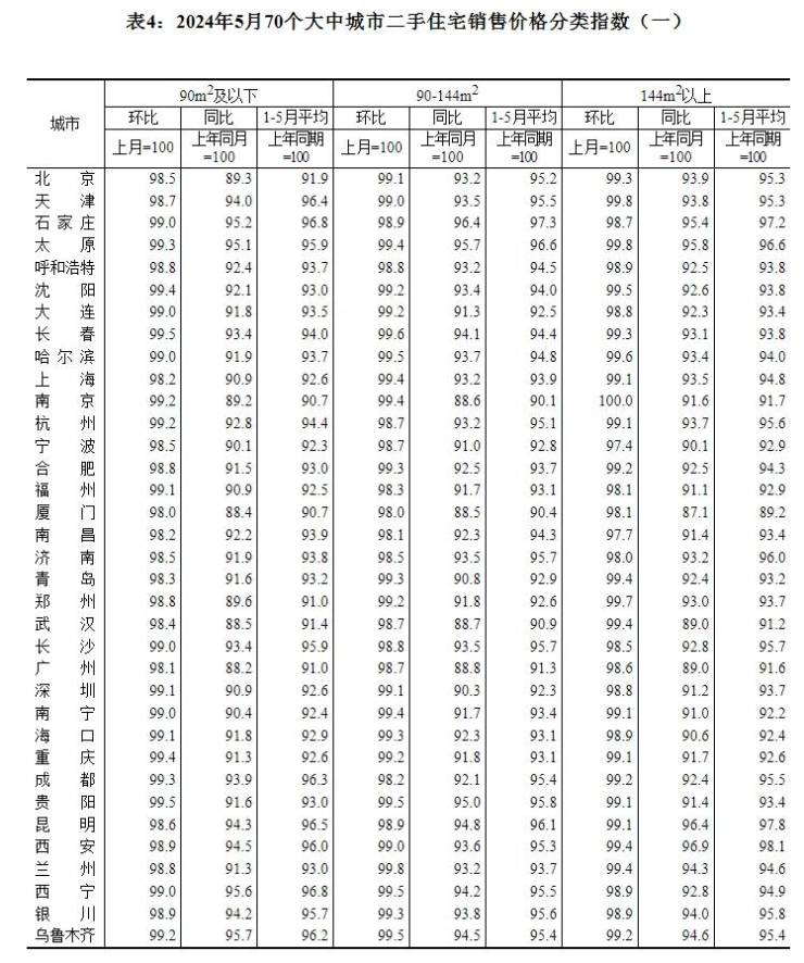 90-144㎡二手住宅销售价格环比下跌1.4%,同比下跌6.4%;