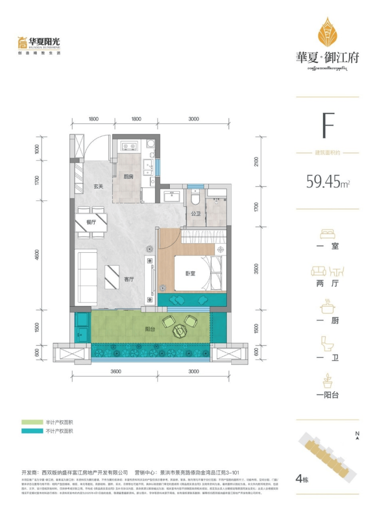 F户型建筑面积59.45平(阳台半面积+花池全面积+飘窗赠送面积+其他)共计赠送约12.73平。