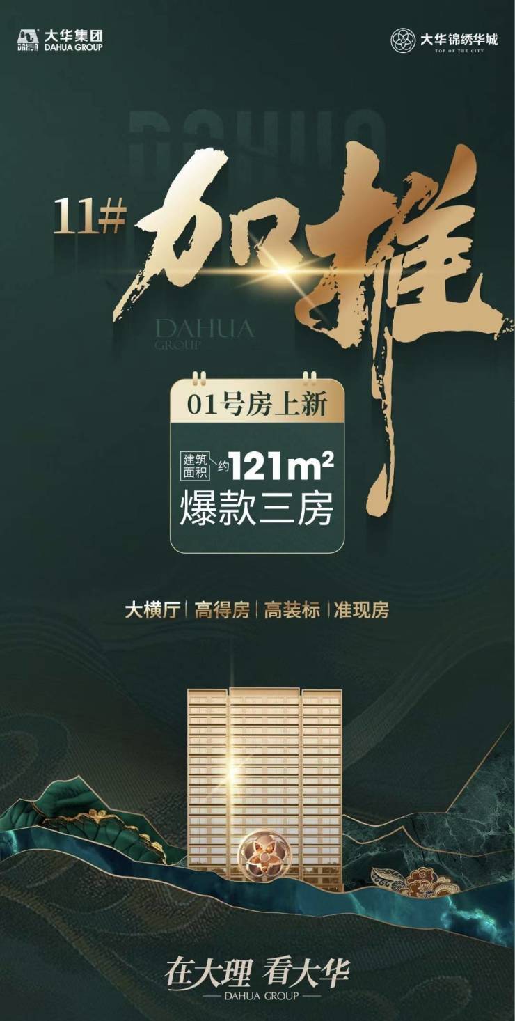 大理大华·锦绣华城,11#建筑面积约121㎡爆款三房加推,大横厅,高得房,高装标,准现房!关注大理大华·锦绣华城的朋友可前往售楼处现场看房,咨询房源信息请拨打电话400-156-0036
