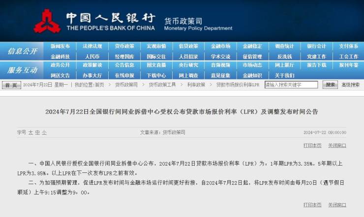 近日,中国人民银行授权全国银行间同业拆借中心公布,2024年7月22日贷款市场报价利率(LPR)为:1年期LPR为3.35%,5年期以上LPR为3.85%。