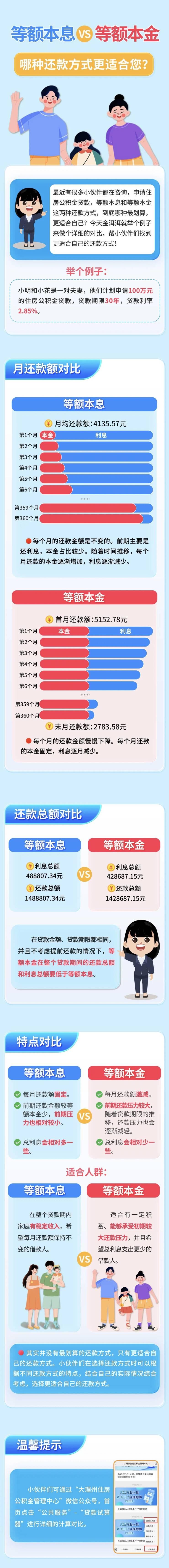 最近有很多小伙伴都在咨询,申请住房公积金贷款,等额本息和等额本金这两种还款方式,到底哪种更划算,更适合自己?