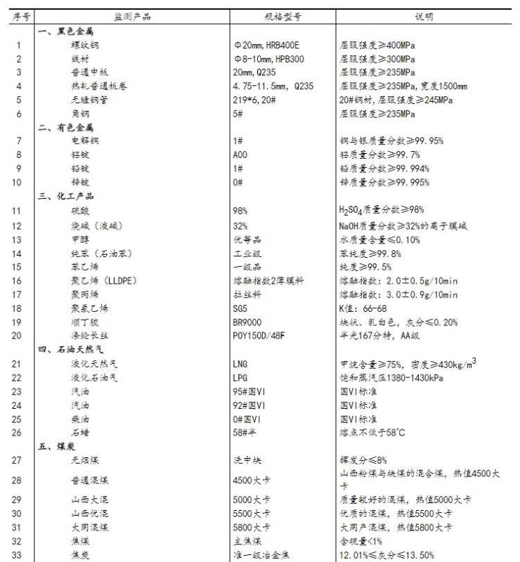 流通领域重要生产资料市场价格监测内容包括9大类50种产品的价格。类别与产品规格说明详见附表。