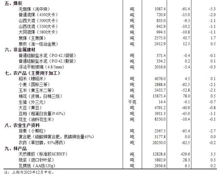 2023年12月下旬流通领域重要生产资料市场价格变动情况