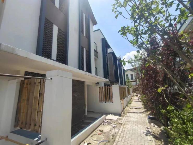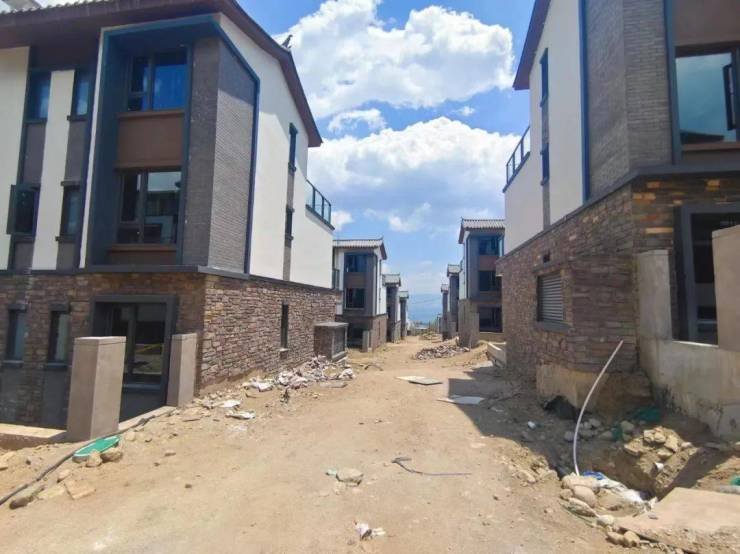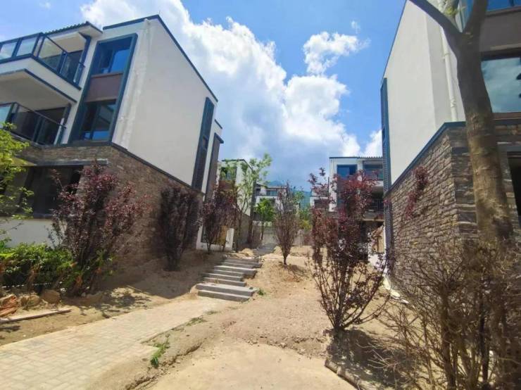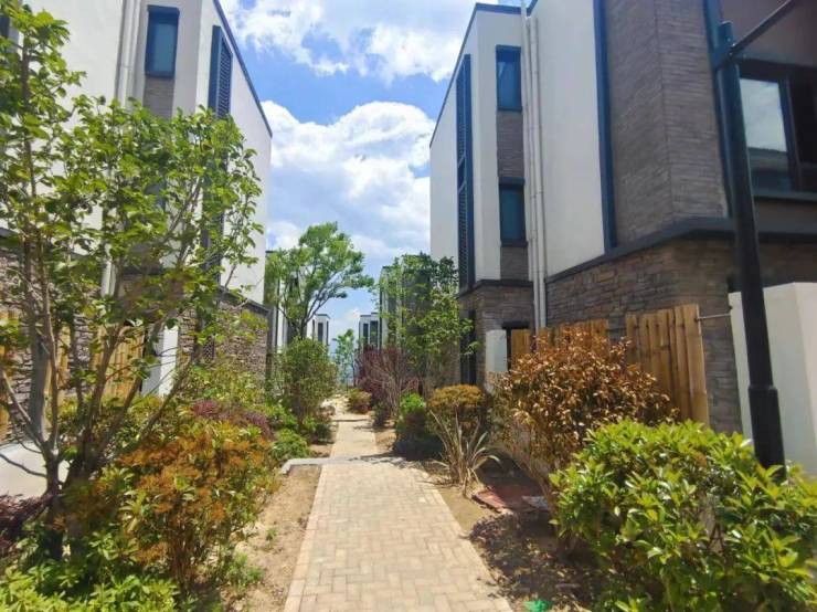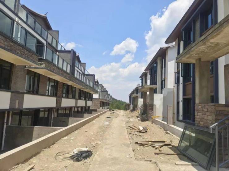 54栋砌体完成100%、内墙抹灰完成100%,外墙抹灰完成100%,屋面防水完成100%;室内防水施工完成100%,外架拆除完成100%;室外抹灰收尾完成100%;室内防水施工完成100%,室内门窗收口完成100%;窗安装完成100%;外墙保温砂浆百分100%、抗裂砂浆完成100%,腻子粉完成100%,涂料完成100%;文化石完成100%,小青砖完成100%,屋面瓦施工完成;庭院给排水管未安装,室内排水、二配安装完成。绿化区域乔灌木栽种完成100%。