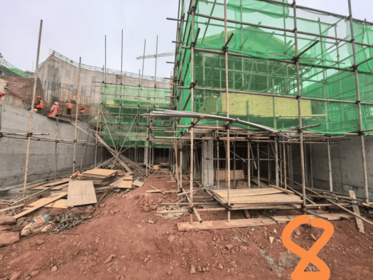 8栋主体封顶完成、砌体完成,内墙抹灰完成,外墙抹灰完成,屋面防水完成,腻子完成100%,露台压顶小青砖完成100%,窗框及固定玻璃安装完成,屋面盖瓦完成,室内二次电管网配管完成,给排水管安装完成,露台栏杆安装完成,涂料完成,外架拆除完成,钢楼梯安装完成,室外附属工程施工中;