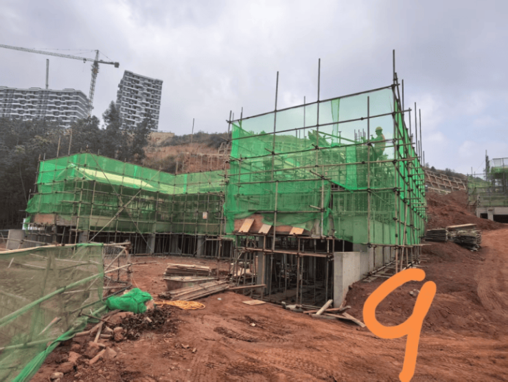 9栋主体封顶完成、砌体完成,内墙抹灰完成,外墙抹灰完成,屋面防水完成,腻子完成100%,露台压顶小青砖完成100%,窗框及固定玻璃安装完成,屋面盖瓦完成,室内二次电管网配管完成,给排水管安装完成,露台栏杆安装完成,涂料完成,外架拆除完成,室外钢楼梯安装完成,室外附属工程施工中;