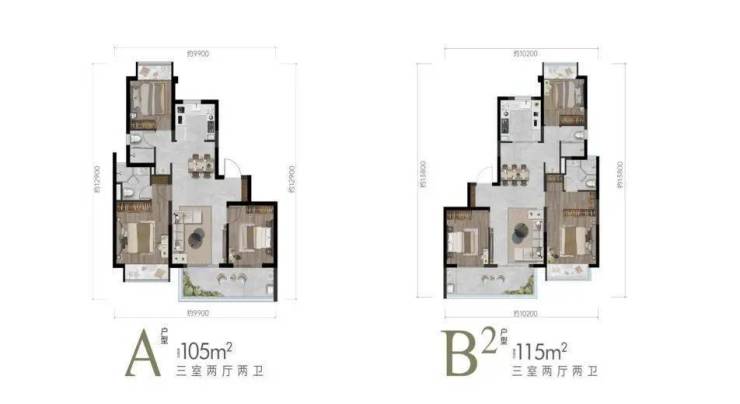 105/115㎡三室两厅两卫:三面宽南向、约5.9~6.1米南向大阳台-超大面采光,空间明亮舒适;入户玄关、外开门-空间利用率高,满足日常收纳功能,私密性好;三段式干湿分离卫生间,方便不同生活需求,带来舒适体验感。