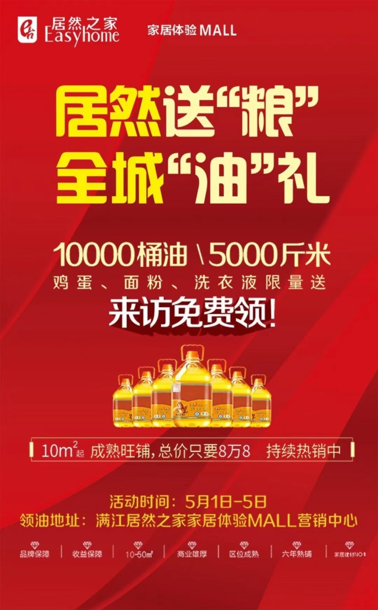 据搜狐焦点大理站获悉,大理居然之家,居然送“粮”,全城“油”礼,10000桶油、5000斤米、鸡蛋、面粉、洗衣液限量送,来访免费领!活动时间5月1日-5月5日,领油地址居然之家家居体验MALL营销中心!