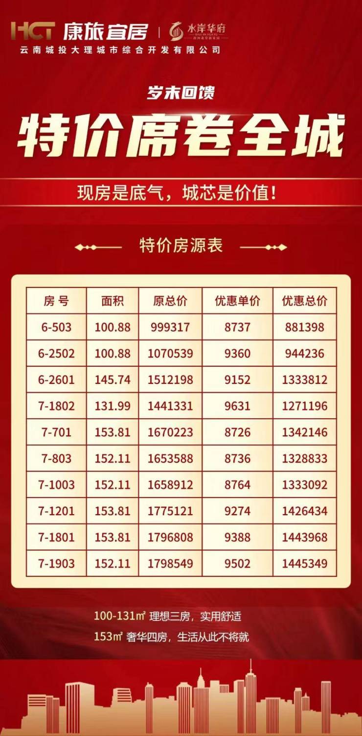 大理水岸华府,岁末回馈特价席卷全城,建面约100-131㎡理想三房,实用舒适|建面约153㎡奢华四房,生活从此不将就!关注水岸华府的朋友可前往售楼处现场看房,咨询房源信息请拨打电话4001560036