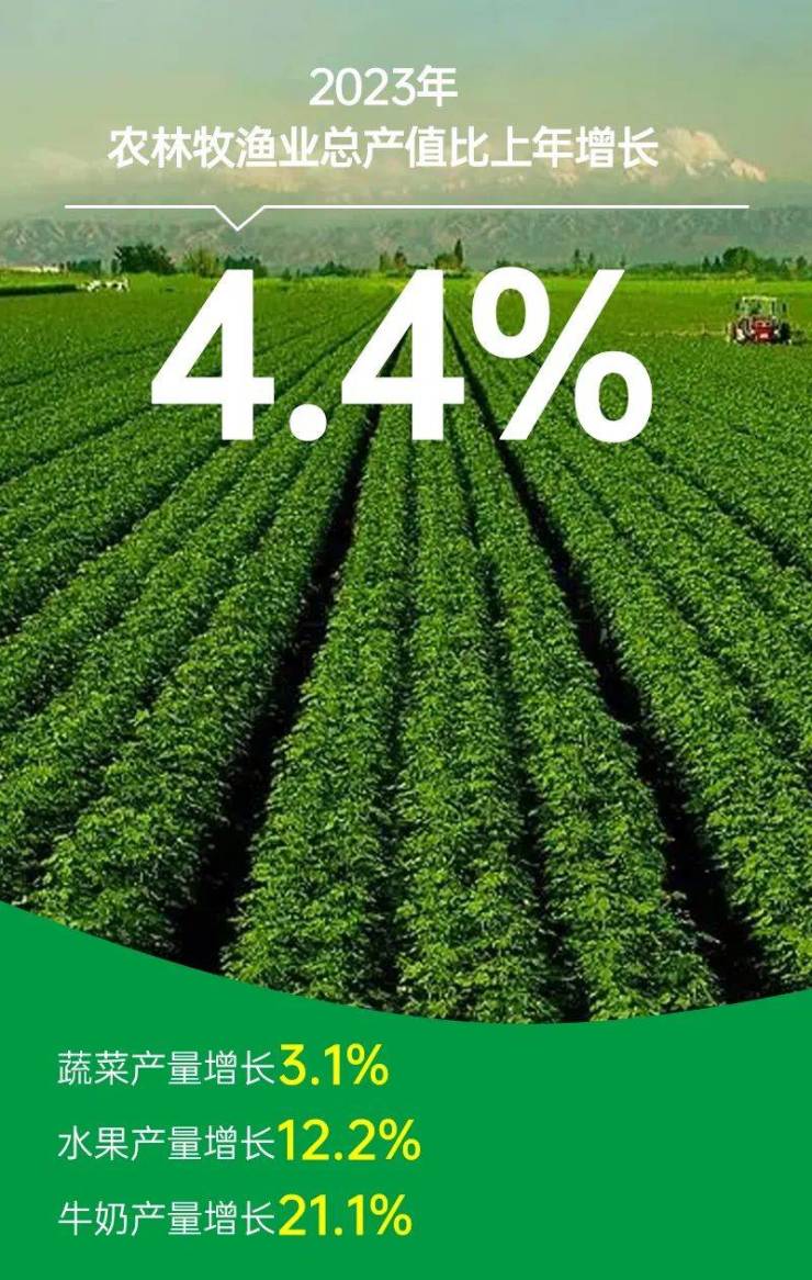 高原特色农业发展质效提升。全年蔬菜产量183.1万吨,比上年增长3.1%,其中葱蒜类产量53.6万吨、增长6.7%,根茎类产量37.1万吨、增长23.6%。全年水果产量155.7万吨,增长12.2%,其中柑橘类产量45.2万吨、增长23.5%,葡萄类产量54.1万吨、增长13.4%。茶叶产量1.40万吨,增长5.4%;核桃产量53.31万吨,增长0.78%。