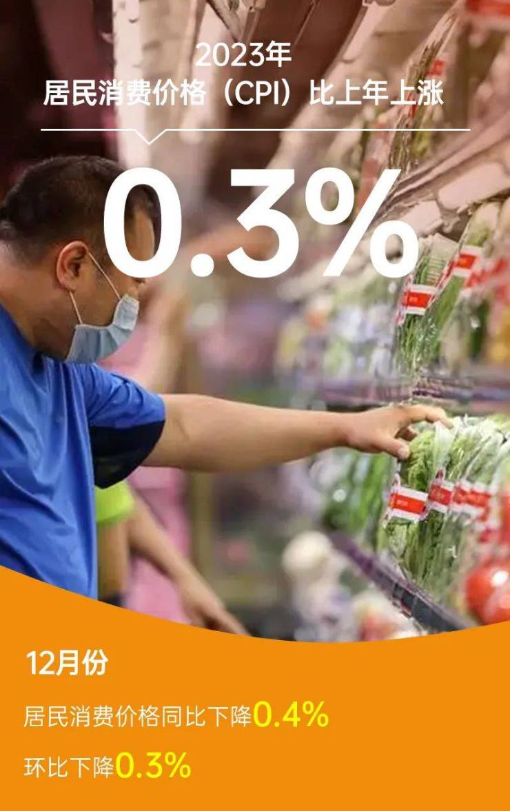 在食品烟酒价格中,猪肉价格下降9.9%,鲜菜价格上涨8.2%,粮食价格下降0.9%,鲜果价格上涨4.1%。扣除食品和能源价格后的核心CPI上涨0.5%。12月份,居民消费价格同比下降0.4%,环比下降0.3%。