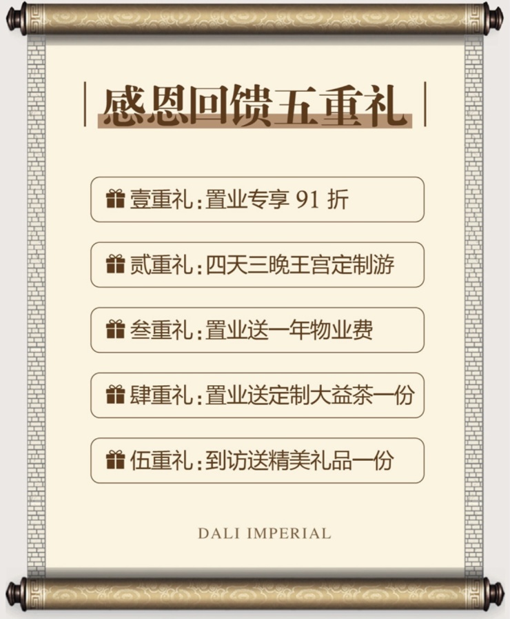 另悉,华侨城·大理王宫,感恩回馈五重礼,置业专享91折;四天三晚王宫定制游;置业送一年物业费;置业送定制大益茶一份;到访送精品礼品一份!