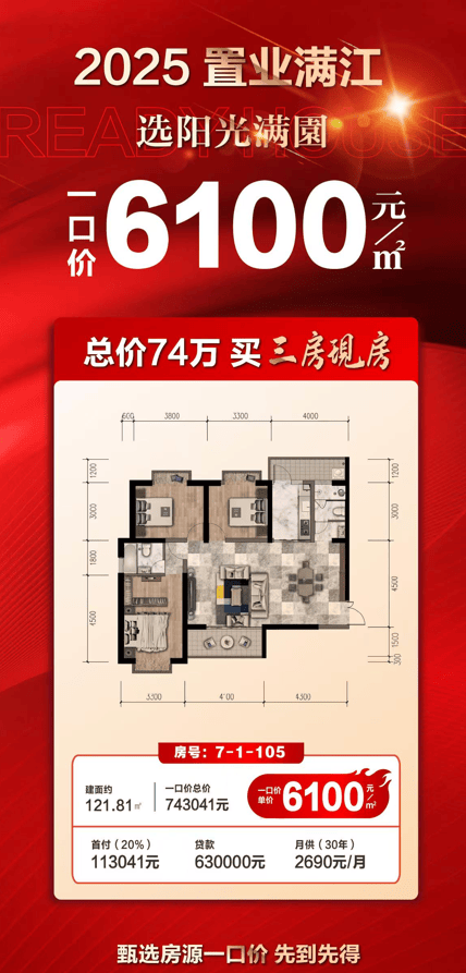 2025置业满江选阳光满園,一口价单价约6100元/㎡,总价74万买三房现房!关注阳光满園的朋友可前往售楼处现场看房,咨询房源信息请拨打电话400-156-0036 转 420081!