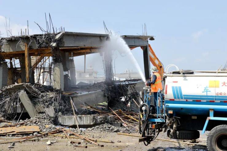 拆除过程中,工作人员拉起警戒线确保安全;拆除工作以机械拆除为主、人工拆除为辅的方式进行,其间进行洒水降尘。待主体建筑拆除完毕后,还将进行建筑垃圾清理等扫尾工作。