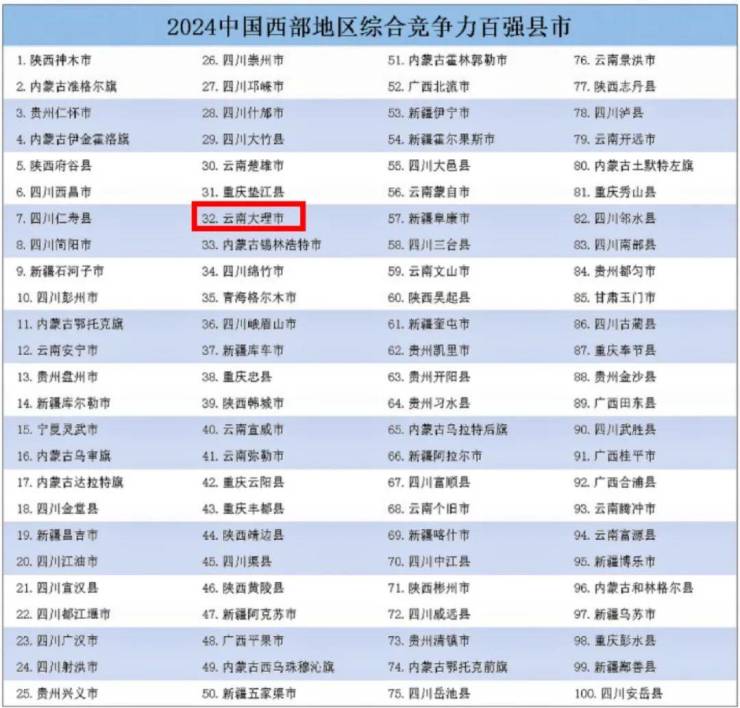 2024年中国西部地区百强县市名单发布!大理市上榜!