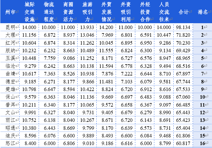 根据具体指标得分,云南16个州(市)开放工作各具特色。例如,昆明在多个指标上位居前列,开放发展综合水平最高,体现出省会城市在开放发展中“领头羊”的地位;大理、玉溪、曲靖的城际交通设施情况较为良好、物流通达程度比较优秀、商圈资源活力丰富、同时具备较大的旅游吸引力,对内开放优势明显;德宏、临沧、西双版纳、红河的外贸整体发展水平较高,外资外经合作紧密,同时国际活动丰富,人员交流往来密切,对外开放优势明显;此外,丽江、昭通城际交通设施不断完善,文山、怒江等外贸增势突出,楚雄加快推进重点项目建设,开放发展的潜力不断聚集。