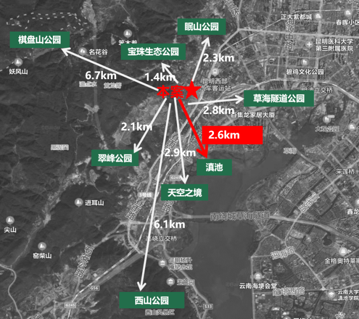 翠峰公园、草海公园、西山森林公园、棋盘山森林公园、宝珠公园、眠山公园六大生态公园环伺。