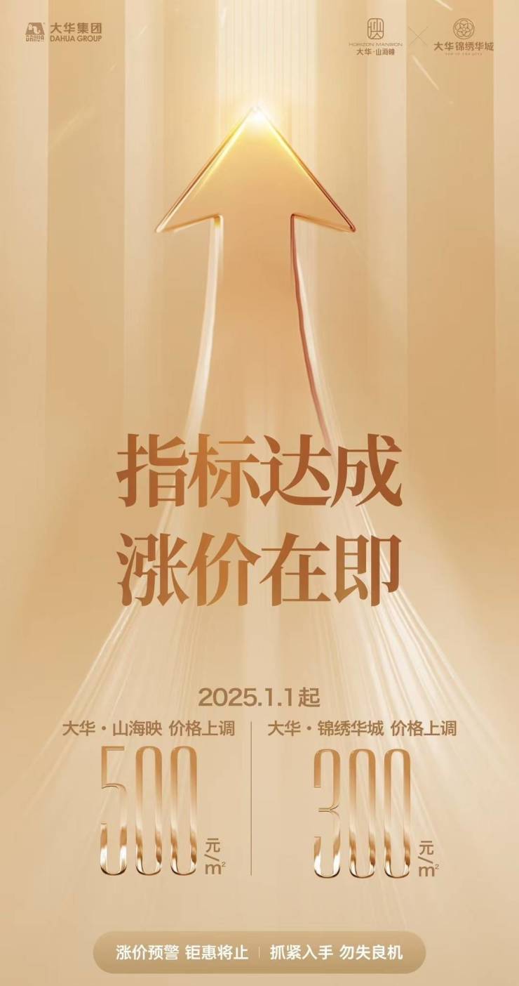 大华·山海映,年度指标达成涨价在即,2025年1月1日起价格上调500元/㎡!关注大华·山海映的朋友可前往售楼处现场看房,咨询房源信息请拨打电话4001560036