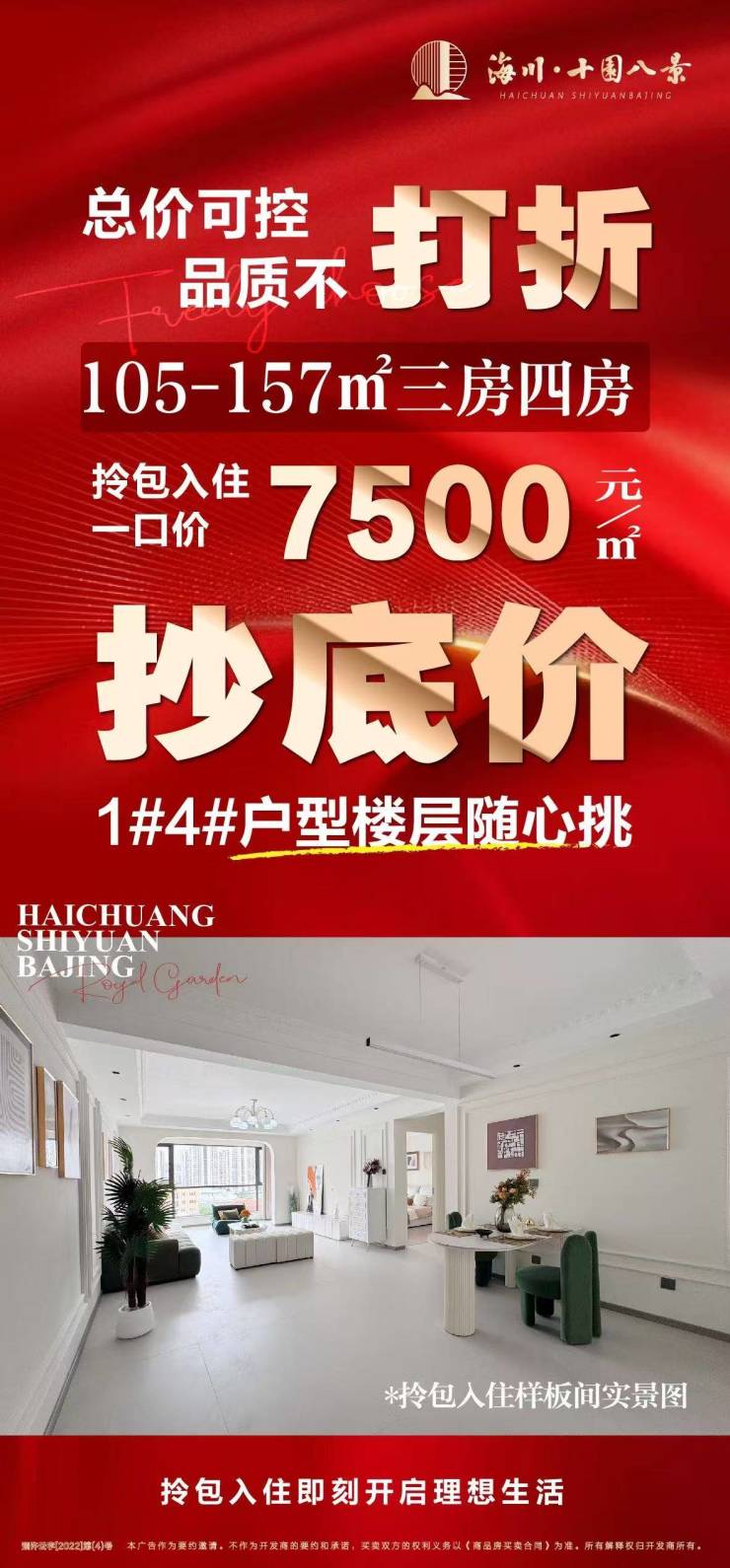 海川·十园八景,建面约105-157㎡三房四房,拎包入住一口价约7500元/㎡起!关注海川·十园八景的朋友可前往售楼处现场看房,咨询房源信息请拨打电话400-156-0036 转 426610!
