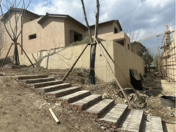 5.室外景观:乔木种植完成90%,室外路面硬化完成90%,路面踏步砌体完成;