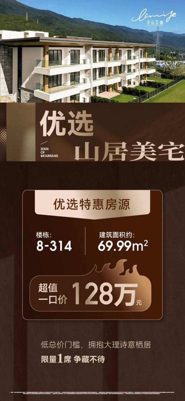 半山艾迪,优选特惠房源推荐,低总价门槛,拥抱大理诗意栖居!关注半山艾迪的朋友可前往售楼处现场看房,咨询房源信息请拨打电话400-156-0036 转 448886!