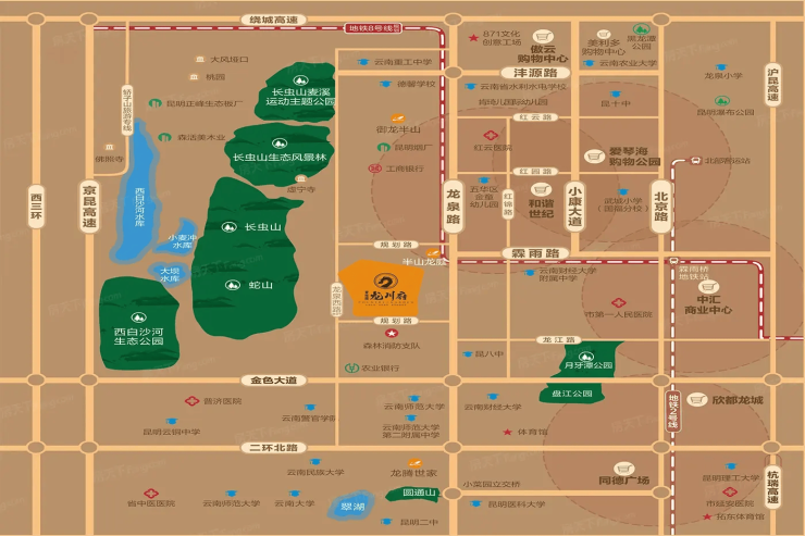 项目周边龙泉路、沣源路等城市主干道纵横交错,15分钟直达昆明长水国际机场,10分钟接驳地铁2号线北部汽车站,构建起“立体交通网络”,让塔尖人士在执掌繁华与私享静谧之间自由切换。更难得的是,项目毗邻百年龙泉古镇,与云南大学、云南师范大学等高校形成文化矩阵,在自然山水之间浸润千年滇派文脉,成就城市中难得的“人文生态住区”。