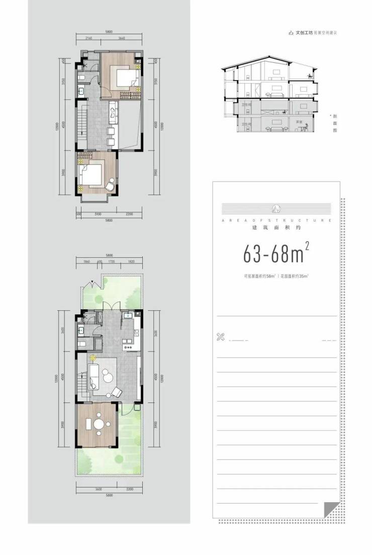 建筑面积约64㎡,实际使用面积约122㎡,花园面积约30-60㎡