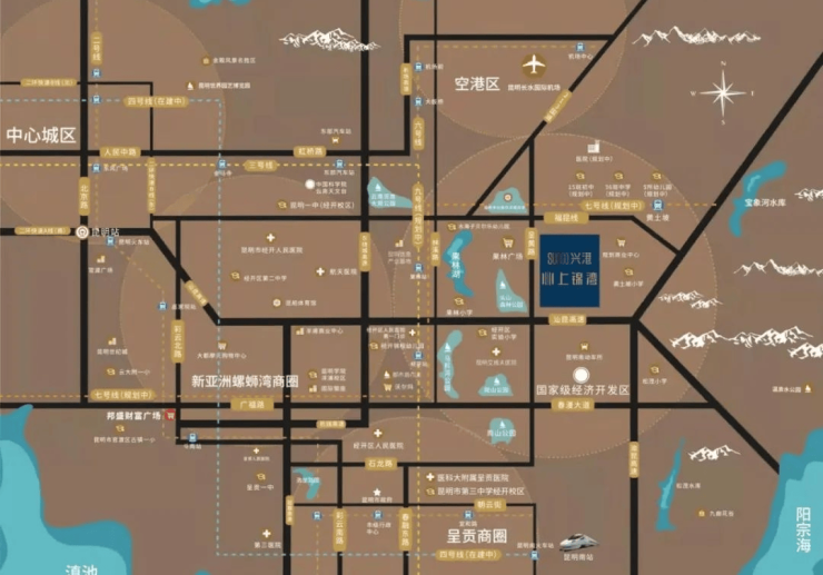 交通:两横两纵的立体交通网络,横向的昆石高速、春漫大道向西直通昆明主城中心区。纵向渝昆高速、经开区主轴石龙路(呈黄线),周边还规划了地铁7号线(黄土坡站)及9号线(经开站);未来整个片区将形成高速公路、轻轨、城市快速干道为一体的立体交通网络,极速通达全城。