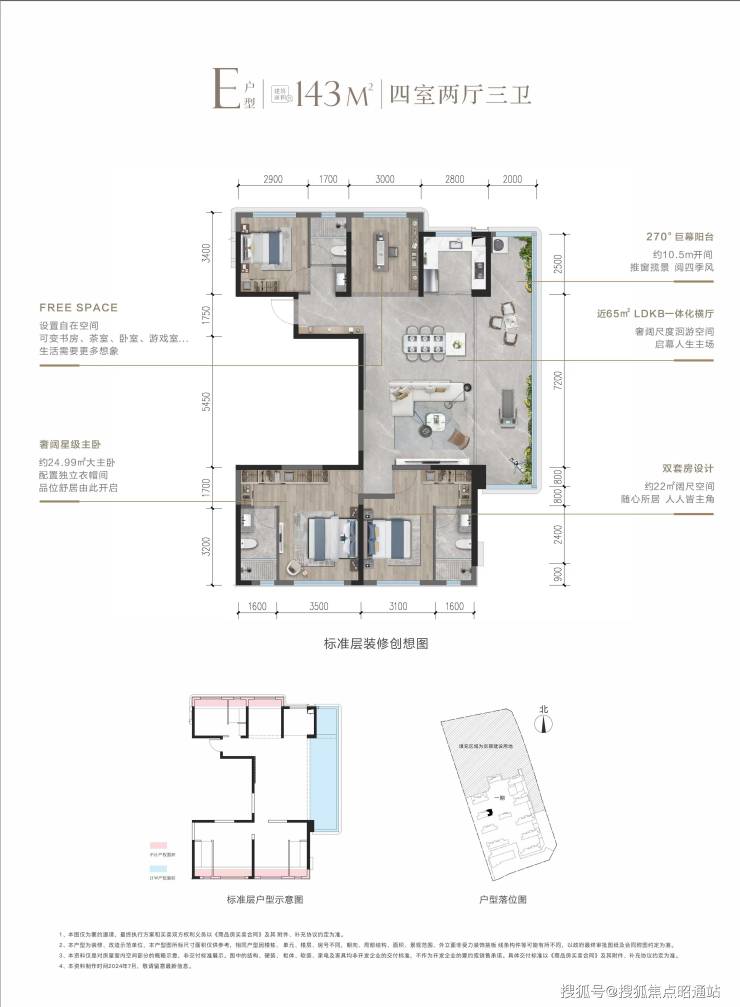 【E 户型】143㎡套四三卫 房率约100%(双主卧套房、10.5米270°全景超大阳台、65㎡LDKB一体化横厅)
