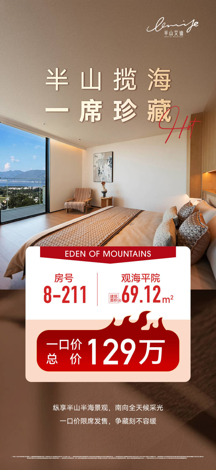 半山艾迪,一口价限席发售,建面约69.12㎡观海平院,一口价总价约129万起!关注半山艾迪的朋友可前往售楼处现场看房,咨询房源信息请拨打电话400-156-0036