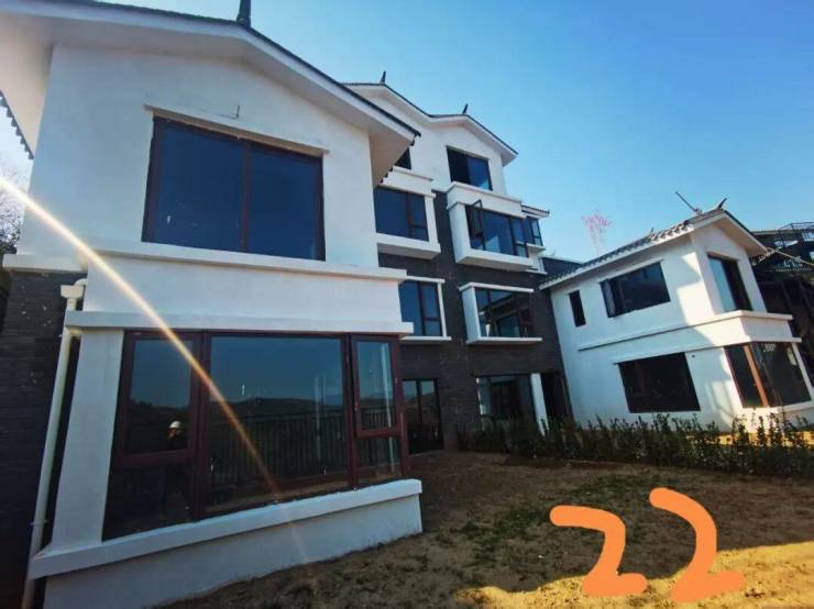 22栋主体已完成、外墙涂料已完成、屋面瓦已完成,庭院院墙完成,入户门完成。栏杆安装完成、室外管网埋设完成、室外景观完成,燃气管网安装完成;