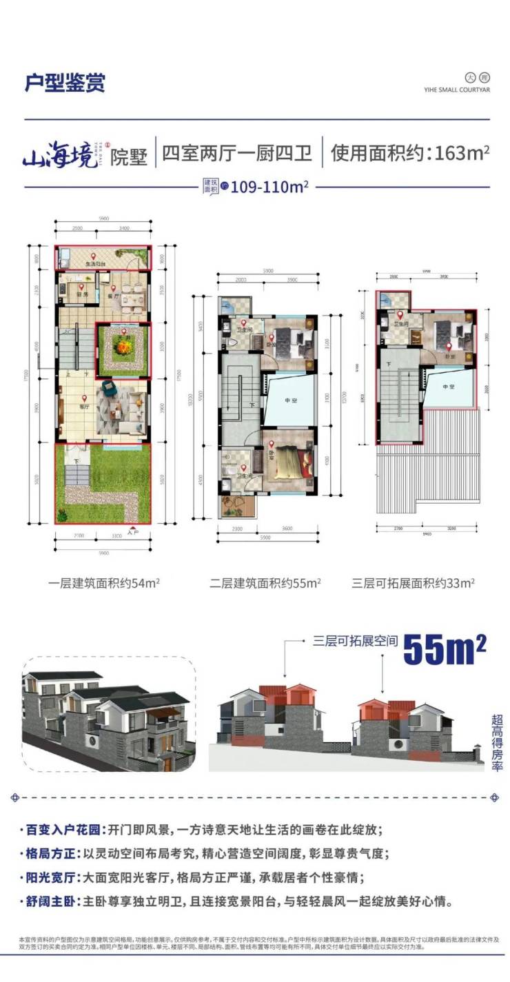 大理古城·颐和小院,山海境·院墅使用面积约163㎡,附加赠送前后花园49㎡(前花园约30㎡,后花园9㎡,天井10㎡)。