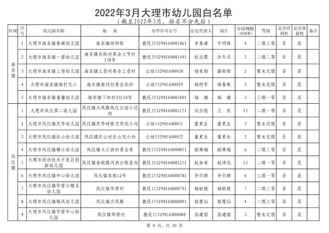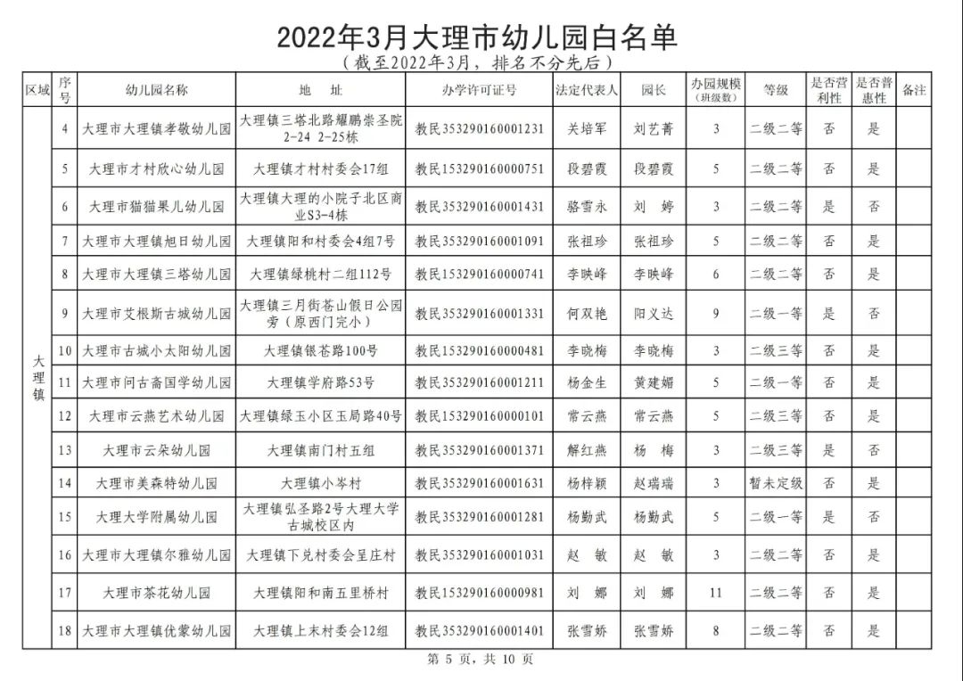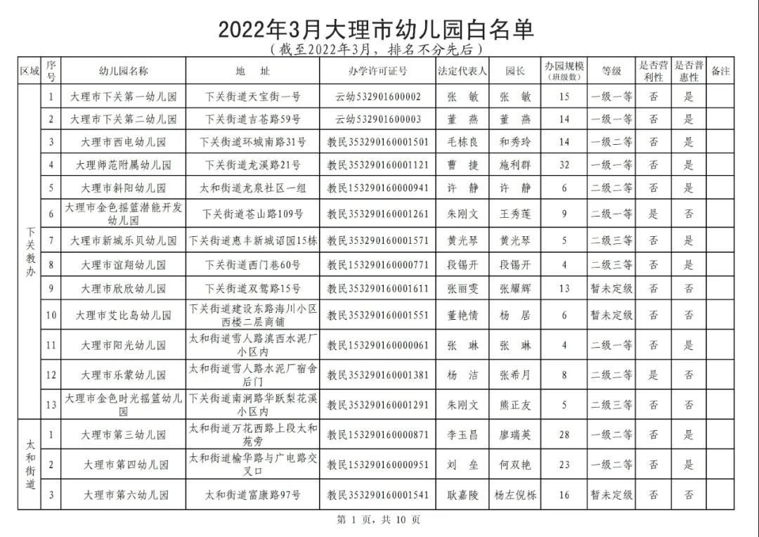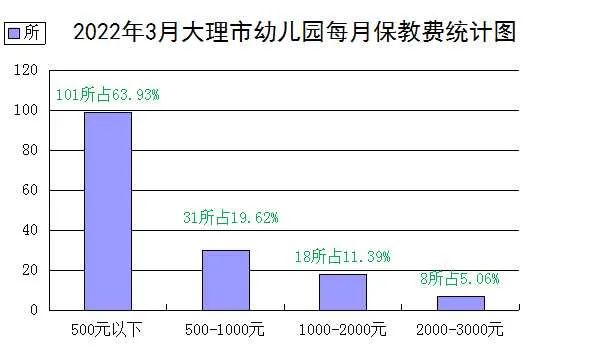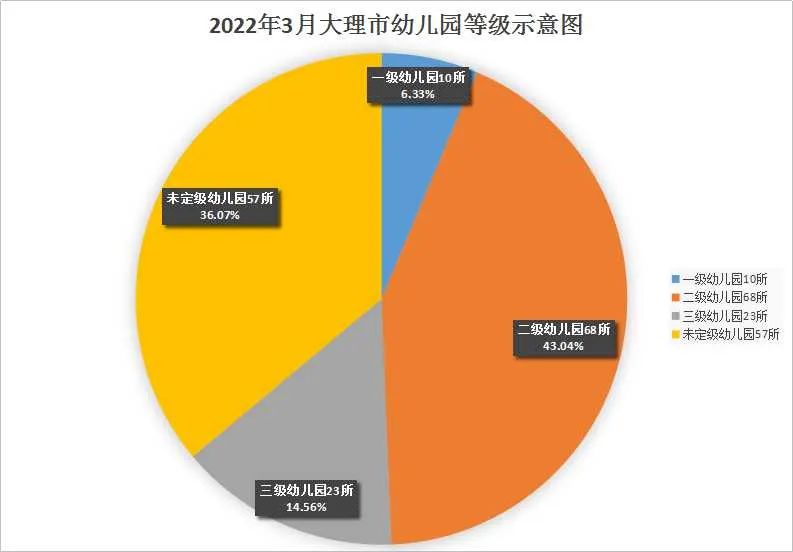 大理市现有幼儿园158所(含在建未运营幼儿园),其中公办幼儿园43所(含班改幼28所),民办幼儿园115所,教职工3059人,在园幼儿25489人,学前三年毛入园率96.20%,学前教育普惠率81.33%。经评估认定的云南省等级幼儿园101所,占幼儿园总数的63.93%,其中:一级10所(一级一等幼儿园6所:大理州幼儿园、下关二幼、大理幼儿园、师范附属幼儿园、大理明珠幼儿园、下关一幼,一级二等幼儿园3所:西电幼儿园、大理市第三幼儿园、大理市第四幼儿园,一级三等幼儿园1所:西窑育苗幼儿园),二级68所,三级23所。在158所幼儿园中,保教费500元/月及以下101所,占63.93%;在500元/月-1000元/月范围内31所,占19.62%;在1000元/月-2000元/月范围内18所,占11.39%;在2000元/月—3000元/月范围内有8所,占5.06%。伙食费按照全部用于幼儿的原则进行管理,一般在300元/月—500元/月之间。大理师范附属幼儿园获全国足球特色幼儿园、全国校园大课间啦啦操推广实施单位等荣誉,西电幼儿园获全国家园共育示范幼儿园等荣誉,大理市第三幼儿园获云南省民办教育优秀幼儿园、云南省青年文明号等荣誉。