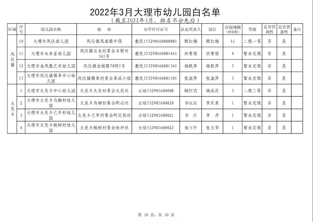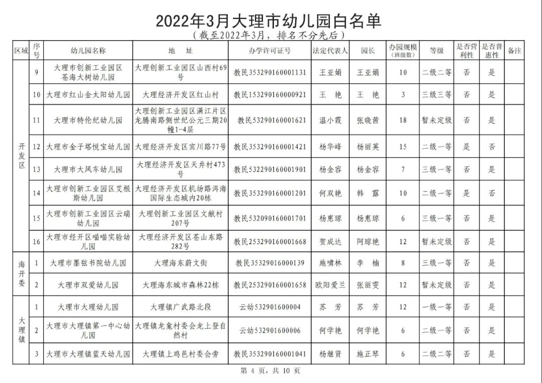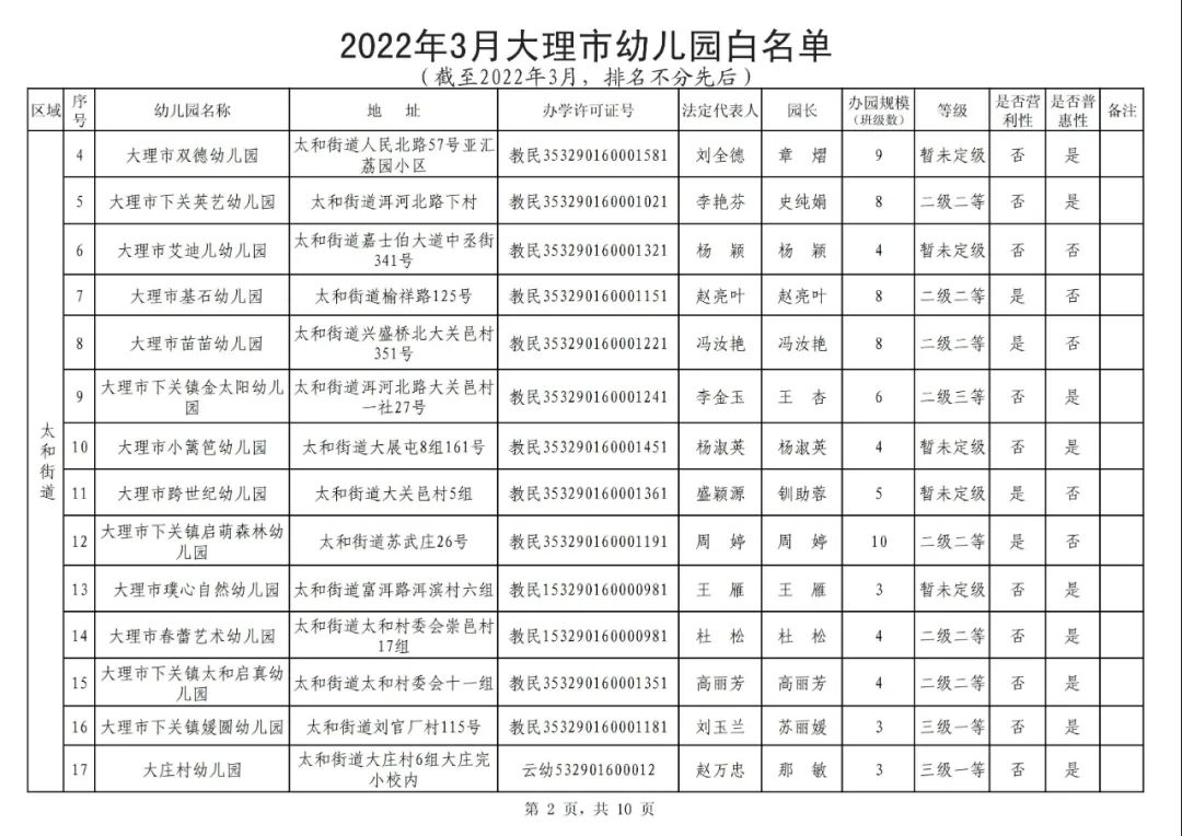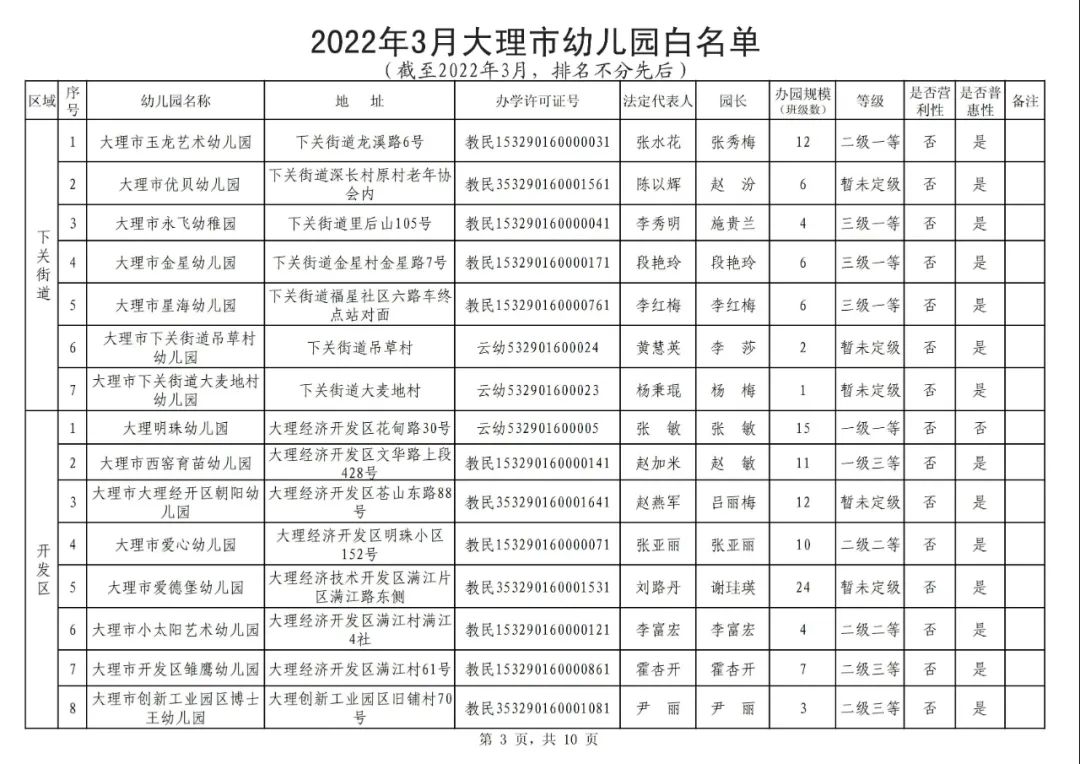 大理市现有幼儿园158所(含在建未运营幼儿园),其中公办幼儿园43所(含班改幼28所),民办幼儿园115所,教职工3059人,在园幼儿25489人,学前三年毛入园率96.20%,学前教育普惠率81.33%。经评估认定的云南省等级幼儿园101所,占幼儿园总数的63.93%,其中:一级10所(一级一等幼儿园6所:大理州幼儿园、下关二幼、大理幼儿园、师范附属幼儿园、大理明珠幼儿园、下关一幼,一级二等幼儿园3所:西电幼儿园、大理市第三幼儿园、大理市第四幼儿园,一级三等幼儿园1所:西窑育苗幼儿园),二级68所,三级23所。在158所幼儿园中,保教费500元/月及以下101所,占63.93%;在500元/月-1000元/月范围内31所,占19.62%;在1000元/月-2000元/月范围内18所,占11.39%;在2000元/月—3000元/月范围内有8所,占5.06%。伙食费按照全部用于幼儿的原则进行管理,一般在300元/月—500元/月之间。大理师范附属幼儿园获全国足球特色幼儿园、全国校园大课间啦啦操推广实施单位等荣誉,西电幼儿园获全国家园共育示范幼儿园等荣誉,大理市第三幼儿园获云南省民办教育优秀幼儿园、云南省青年文明号等荣誉。