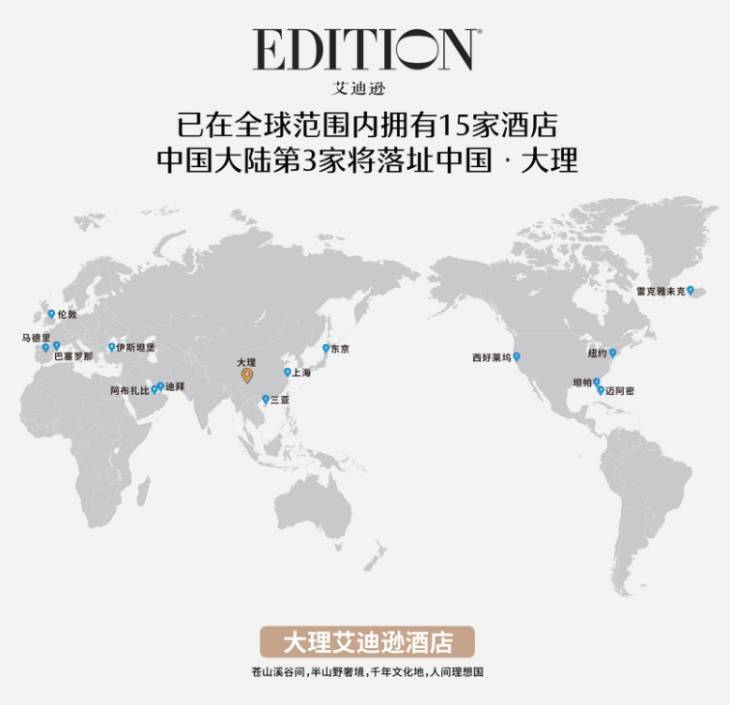 艾迪逊EDITION是隶属于万豪酒店管理集团的奢华品牌,以“新一代奢华”的理念打造别具一格的国际化生活范式。大理艾迪逊酒店属于中国大陆第三家艾迪逊酒店,将刷新大理奢华酒店市场的高度。