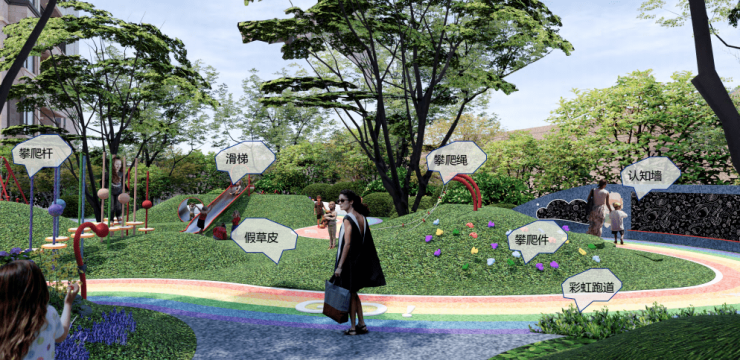 儿童活动空间,以流动的云朵为元素,通过视觉、嗅觉、听觉多重感官体验,以玩闹、探索、认知、运动等不同功能区域,通过滑梯、攀爬区域、认知墙、记忆大树、秋千、探险之谷、峡谷之门、云飘平原等玩闹社区,打造适合全龄段儿童的活动空间。