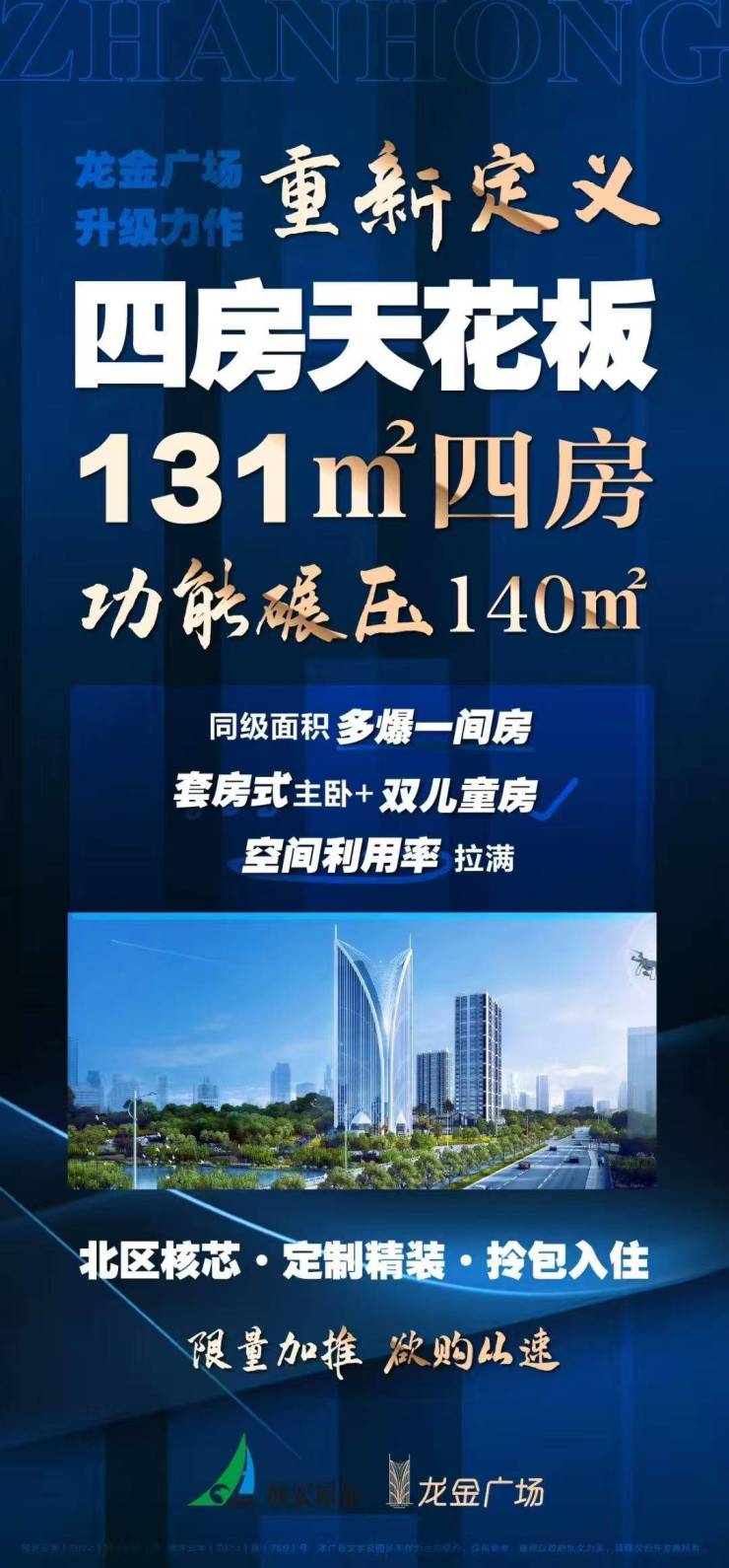 展宏·龙金广场,建面约131㎡四房限量加推,北区核芯,定制精装,拎包入住!关注展宏·龙金广场的朋友可前往售楼处现场看房,咨询房源信息请拨打电话4001560036 转 451395!