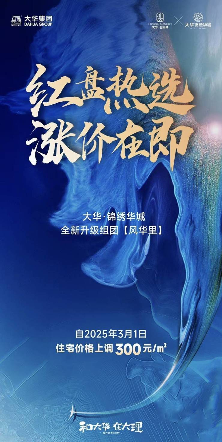大理大华·锦绣华城,红盘热选涨价在即,自2025年3月1日起住宅价格上调300元/㎡!关注大理大华·锦绣华城的朋友可前往售楼处现场看房,咨询房源信息请拨打电话400-156-0036