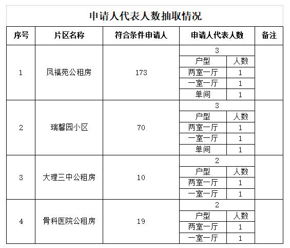 2.摇取申请人代表。在公证及相关部门的监督下,抽取大理经济技术开发区2025年度公共租赁住房凤福苑公租房、瑞馨园小区、大理三中公租房、凤仪骨科医院公租房申请人代表,负责启动所在区域摇号系统。抽取人数如下表: