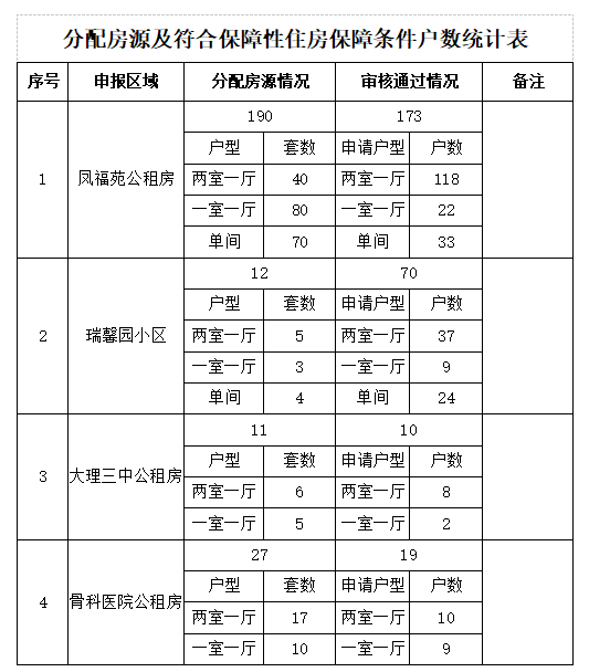 (一)凤福苑公租房:本次分配房源190套,其中户型包括:两室一厅、一室一厅、单间,房源位于大理市凤仪镇河西村凤福苑公租房,户型及面积具体情况以现房为准。