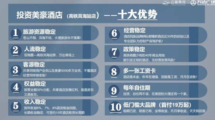 美豪酒店(高铁洱海站店)由独立的酒店经营方和专业的管理团队全权负责酒店的经营,大品牌护航,长远经营;经营方自持2层酒店,前期投入几千万,对大理旅游市场进行了严密的调研,十分看好未来前景,与业主共进退,全力经营好酒店,保障业主的资产。并且美豪酒店采用市场上少有的15 年长周期签约酒店托管产品,第5-8年的酒店翻新费用由承租方负责,业主后期不再投入一分钱,长久保障,运营无忧。