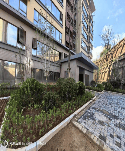 室外工程:室外给水、污水、雨水、消防水管道预埋完成;3栋室外人行道施工完成;绿化完成50%。