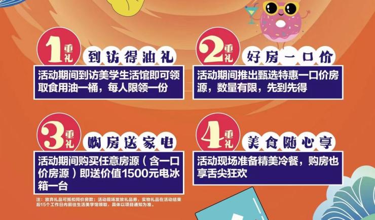 到访得油礼:活动期间到访美学生活馆即可领取食用油一桶,每人限领一份。好房一口价:活动期间推出甄选特惠一口价房源,数量有限,先到先得。
