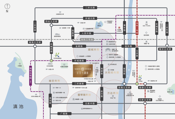 向北有顺城王府井商圈,东有大悦城商圈,南邻万达双塔、润城第一大道商圈,西连南亚风情第壹城商圈,东南西北四大成熟商圈汇聚了全昆明最齐全的娱乐休闲品牌,而且距离项目1.5KM以内,步行即可到达。